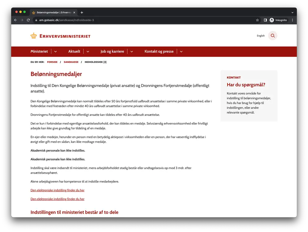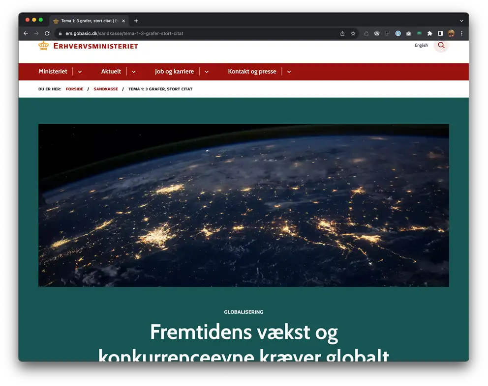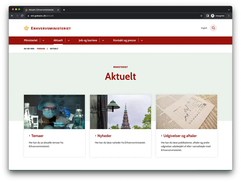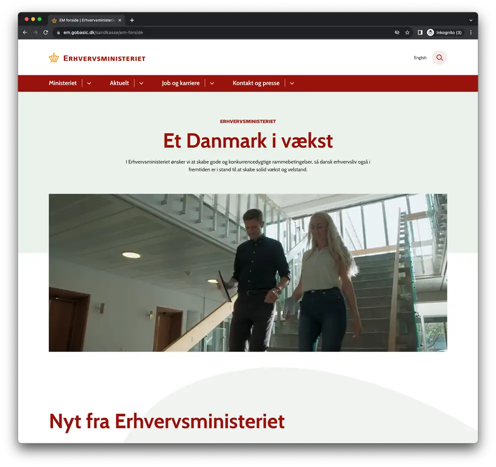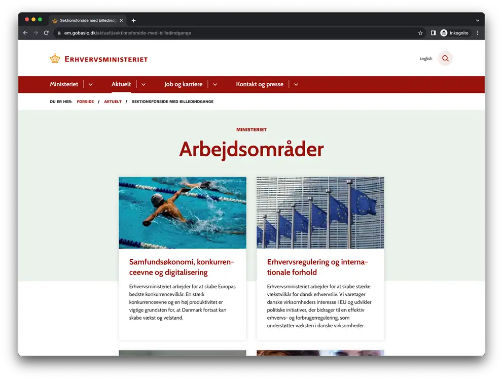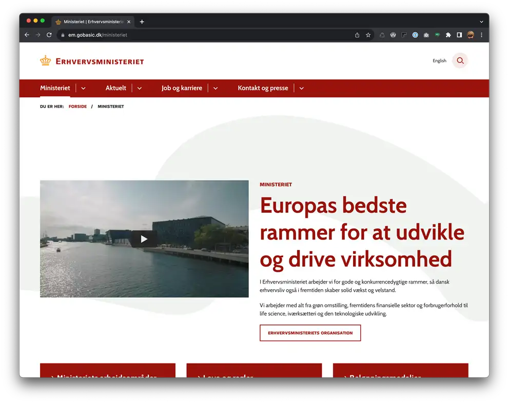 Denne sidetype er en såkaldt sektionsforside, hvor man i toppen af siden introducerer sidens indhold, her i form af en video om ministeriet og en kort tekst, hvorefter man introducerer felter til "transport"/links:
