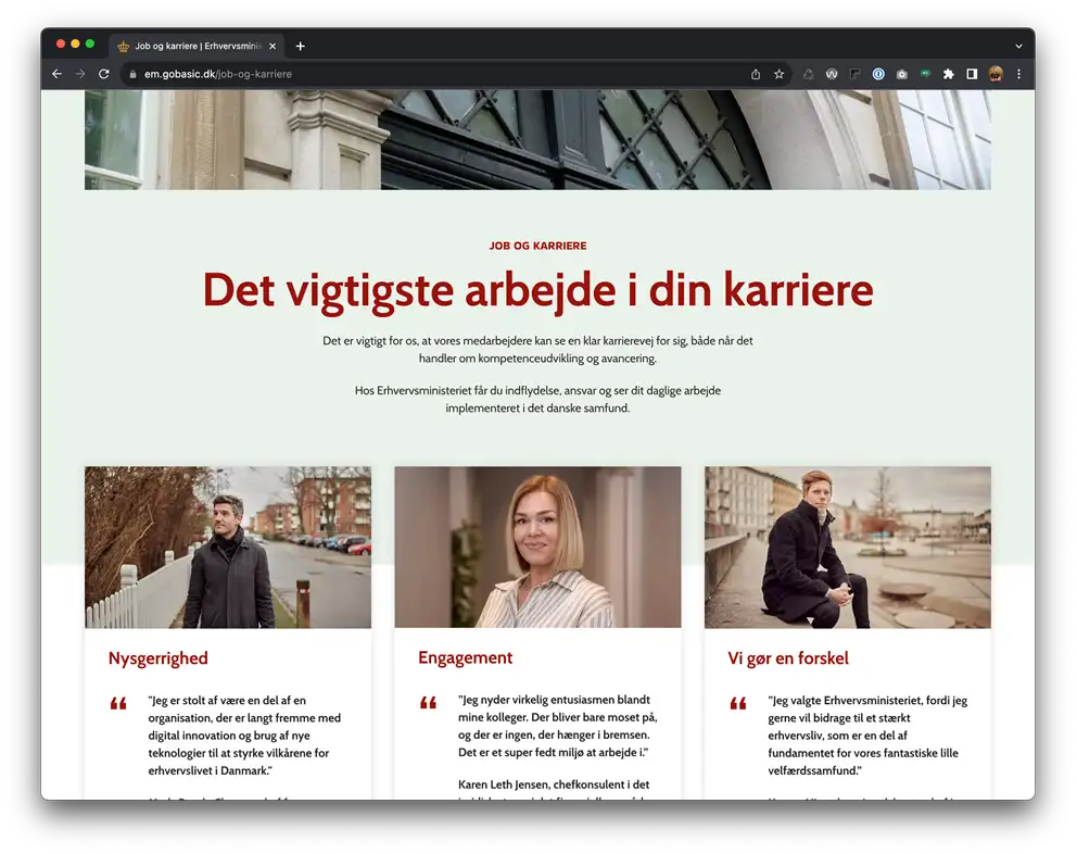 På den visuelle side findes et "overlap", hvor tre medarbejdere lapper op i intro-feltet med et citat. Disse tre kasser kunne f.eks. udskiftes med grafer, tabeller eller links til undersider på den side, du er ved at oprette. Mulighederne er mange.