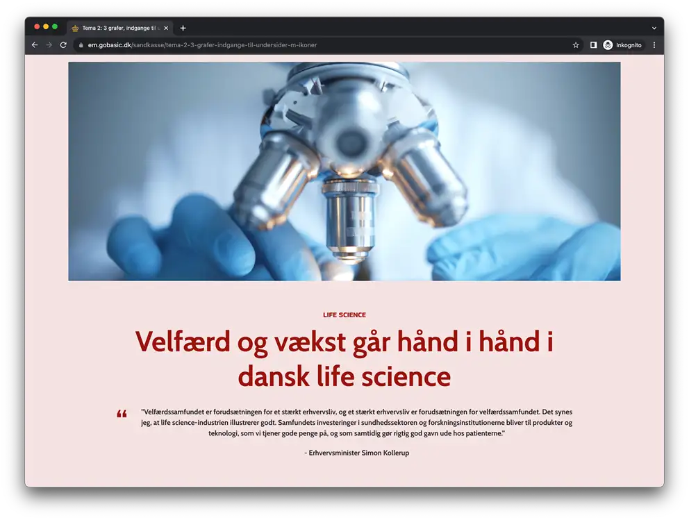 F.eks. kunne man bruge denne sidetype til en særlig kampagne eller et tema, Ministeriet er igang med at promovere. Det handler blot om at udskifte indholdet i kasserne, så det passer til den side du er ved at oprette.