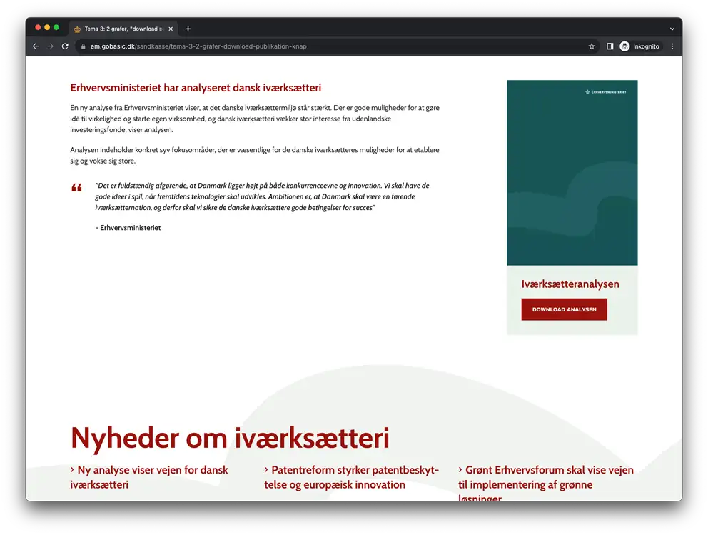 Som de andre tema-skabeloner starter denne også med et introducerende tekstfelt, og plads til overlappende grafer eller andre informationer, men hvad der særligt adskiller sig ved dette tema er den fremhævede publikation (i dette tilfælde "Iværksætteranalysen"):