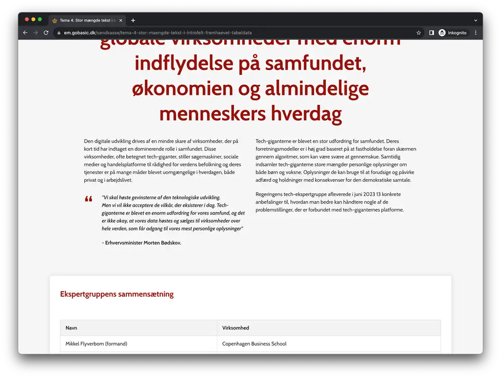Tema 4: Stor mængde tekst i introfelt, fremhævet tabeldata