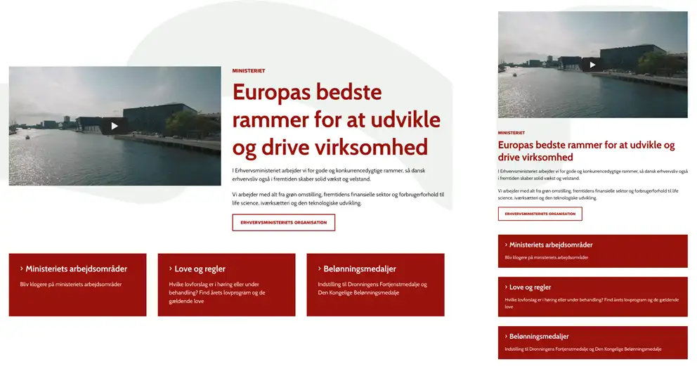 • Jeres hjemmeside er responsiv, det vil sige elementer og deres rækkefølge tilpasser sig visning på tablets og mobiltelefoner. Fx vil en boks, der ligger “til højre” på en stor skærm, vil med al sandsynlighed ligger “under” på en mindre.